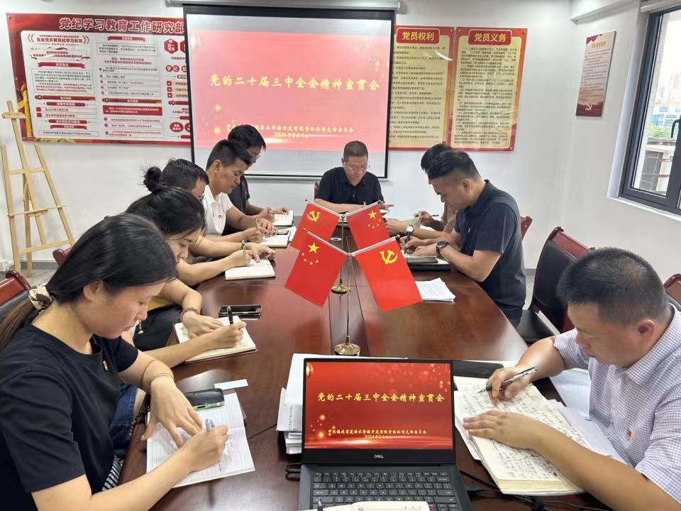 水投设计公司党支部积极掀起党的二十届三中全会精神学习热潮,推动全会精神在公司上下落地生根。一是开展理论学习,“入微入细”学习全会精神。公司党支部第一时间组织全体党员、理论学习读书班成员及青年理论学习小组成员学习会议公报和《决定》,引导公司全体党员干部群众自觉把思想和行动统一到全会精神上来。二是组织主题宣讲,“入情入境”理解全会精神。以党的二十大宣讲团为依托,采用“线上+线下”的方式,已开展党的二十届三中全会主题宣讲6场次,触类旁通、融会贯通,将习近平总书记关于进一步全面深化改革的重要论述与公司改革发展有机关联。三是激活党建矩阵,“入脑入心”贯彻全会精神。依托于全会精神的贯彻落实,持续推进“链上党建”工作,已与13家单位签订党建联盟协议。公司官网、文化墙开设专栏,更新全会相关图文资料,随时学、广泛学、深入学,帮助全体职工深刻领悟党的全会精神要义。