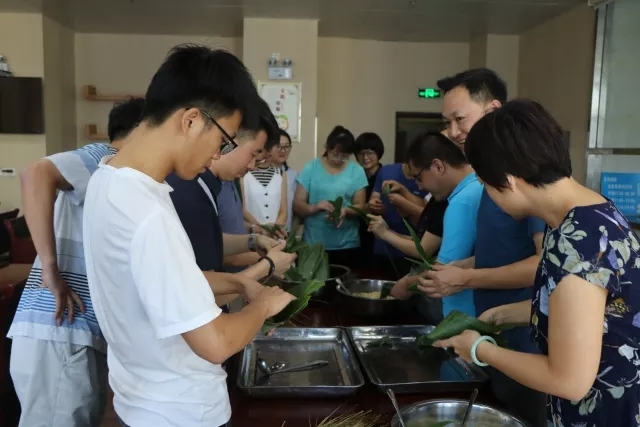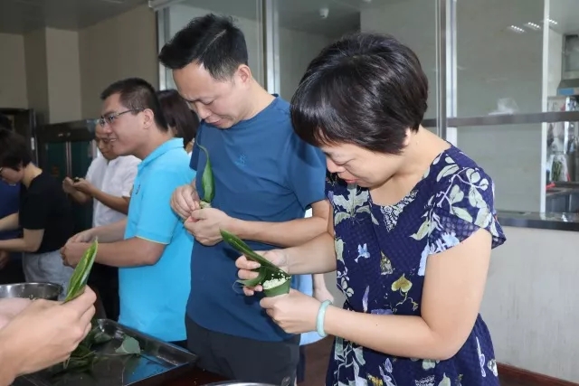 上午10点,包粽子活动正式开始,大家围在一起,纷纷露出看家本领,卷粽叶、放糯米、扎线口,巧手翻飞,气氛异常活跃。