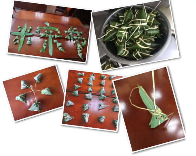 在包粽子过程中,大家互相交流,互相学习,不会包的员工拿着竹叶一步一步的跟着会包的学习。一张张粽叶在员工灵活的手中瞬间变成了一个个有棱有角的爱心粽子。